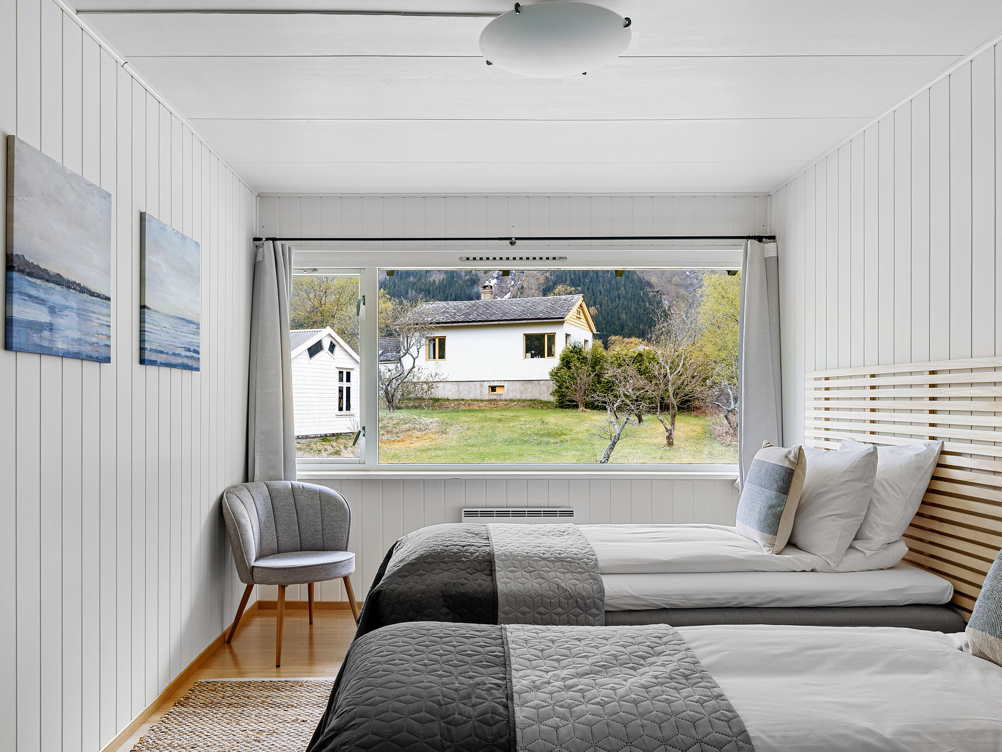 Trippelrommet byr på en varm og avslappet atmosfære med lyse vegger, tregulv og naturinspirerte detaljer. De store vinduene slipper inn rikelig med dagslys og gir utsikt mot fjellene og hagen rundt hotellet – et fredelig sted å trekke seg tilbake etter en dag i naturen.