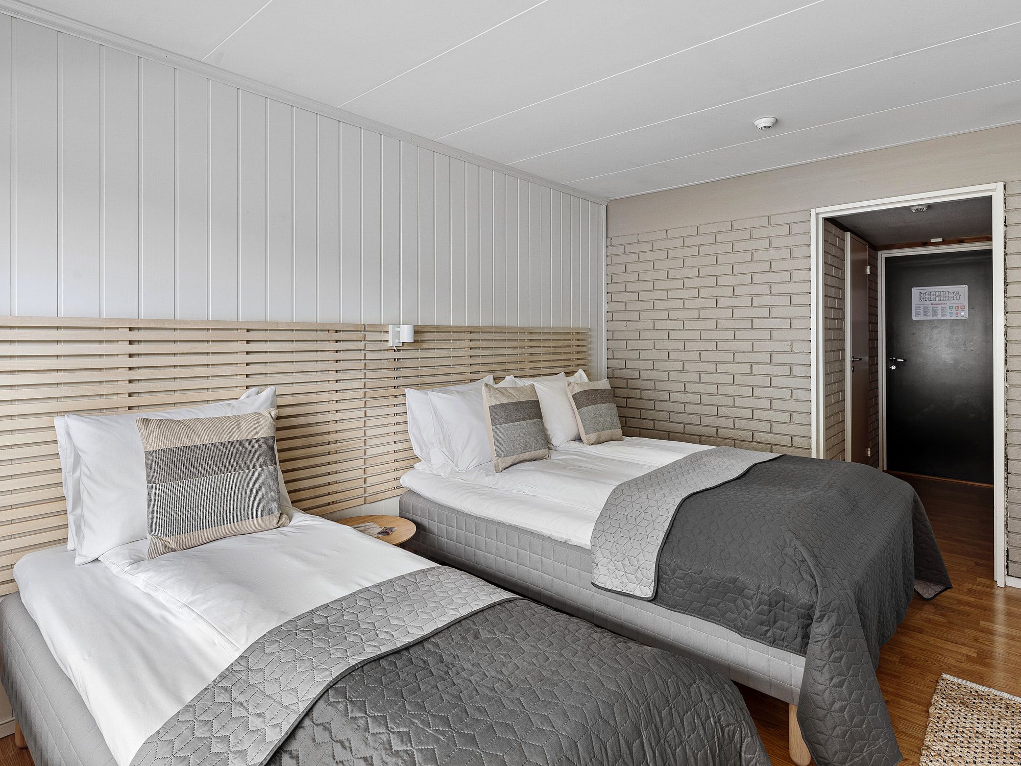 Rommene er utstyrt med en komfortabel dobbeltseng og en enkeltseng, med myke tekstiler som gir en lun og rolig stemning. Den enkle, skandinaviske stilen gir følelsen av luft og plass, samtidig som du har alt du trenger for et hyggelig opphold.